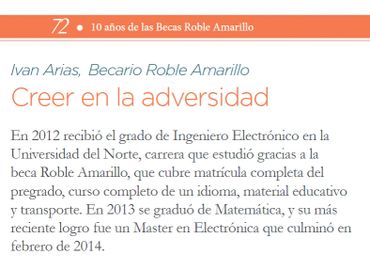 Presidente Santos entrega a Iván (al lado de la ministra de educación) beca para realizar estudios de doctorados en Ingeniería Eléctrica en prestigiosa universidad americana. "Quiero agradecerle a COLCIENCIAS y a la Presidencia por incentivar todas estas políticas para la promoción de la Ciencia y la investigación en el país", menciona Iván en su discurso de agradecimiento.